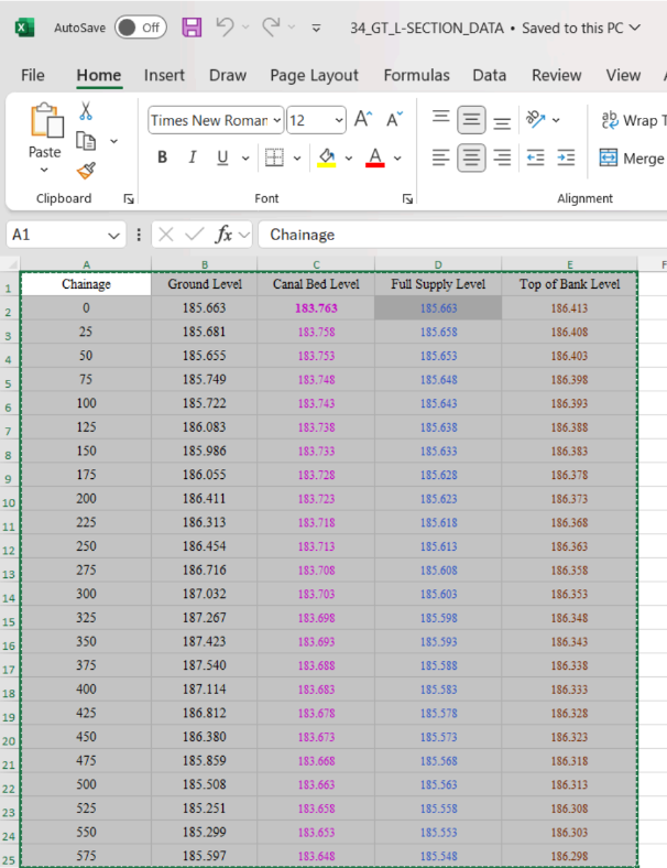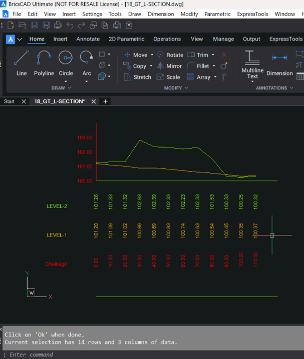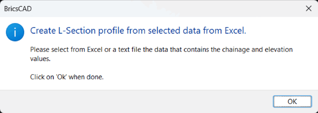 Der Befehl GT_L-SECTION wird verwendet, wenn keine 3D-Polylinie vorliegt, Sie jedoch eine Excel-Datei haben, die Kettenpunkte und Höhen in zwei Spalten enthält.