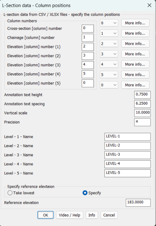 Das Dialogfeld GT_L-SECTION ermöglicht es Ihnen, die Positionen der verschiedenen Designwerte aus Excel festzulegen. Hier müssen Sie die Spaltenpositionen für Kettenpunkte, Höhen und weitere Informationen wie Textgröße, Abstand usw. angeben.