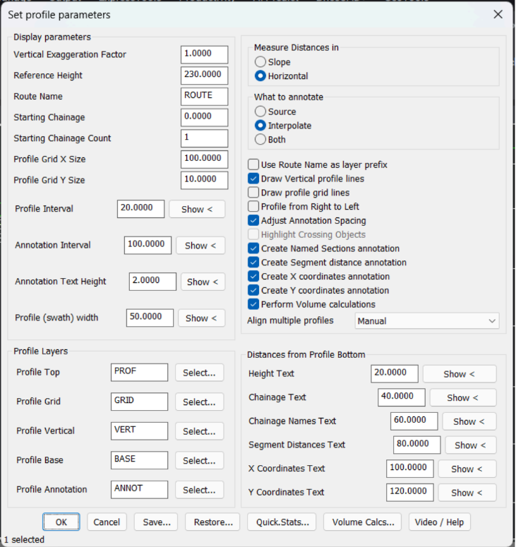 Das oben gezeigte Dialogfeld ist weitgehend selbsterklärend. Sie können dort die wichtigsten Parameter wie Profilintervall, Beschriftungsintervall, Referenzhöhe, vertikale Maßstäbe und weitere Optionen festlegen.
