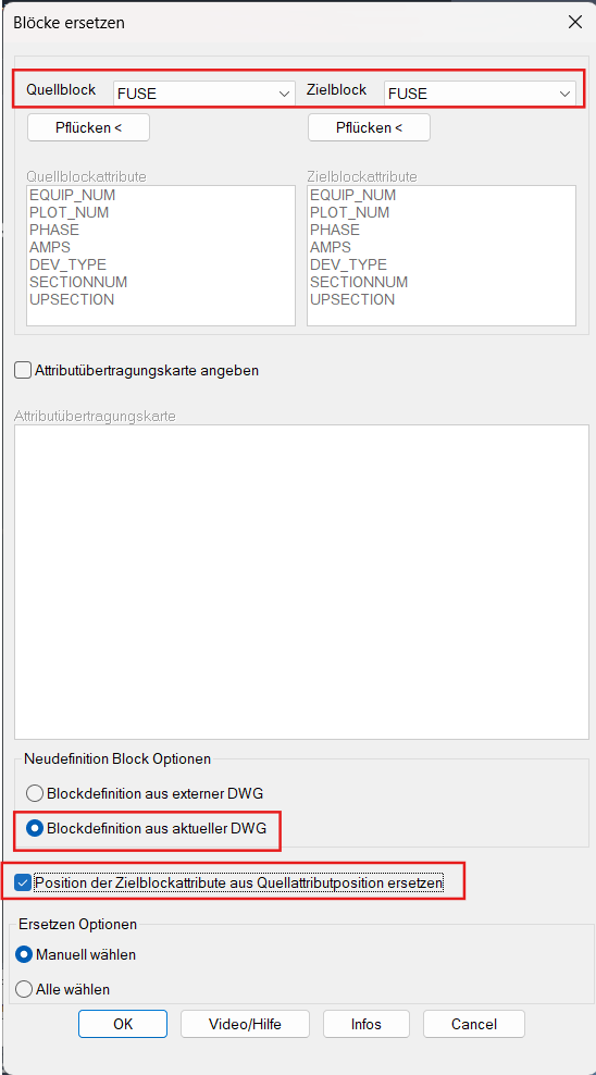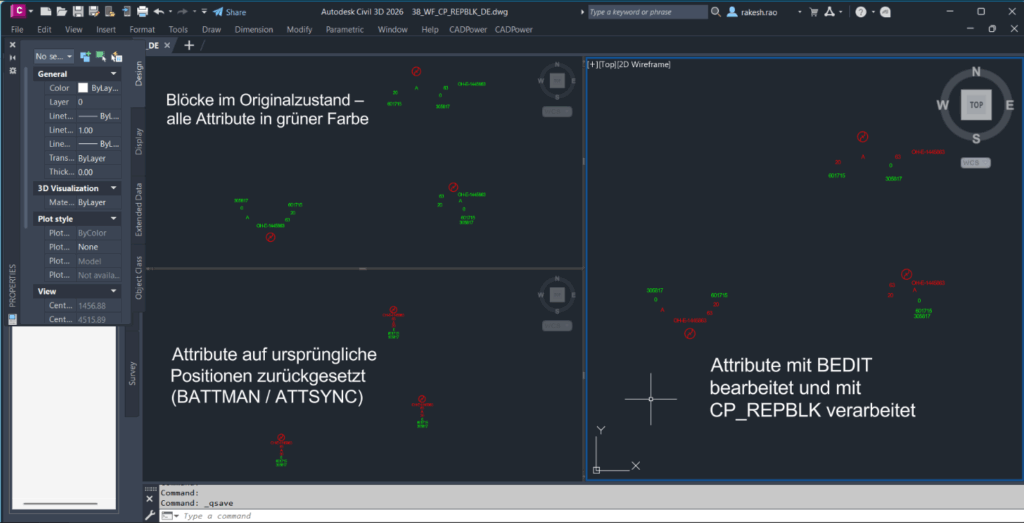 Der Befehl CP_REPBLK (CADPower -> Blocks -> Block-related -> Replace Block) kann hier verwendet werden, um nicht nur die Blockdefinition zu aktualisieren, sondern auch sicherzustellen, dass die verschobenen Attribute ihre Positionen beibehalten und nicht auf ihre ursprünglichen Orte zurückgesetzt werden.