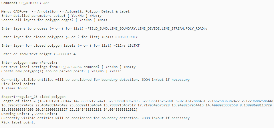 Input transcript of the CP_AUTOPOLYLABEL command, along with command-line output