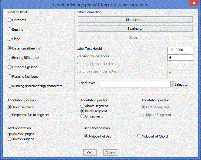 Distances@Bearing: Choosing this option creates the annotation in the format 'Distance @ Bearing'