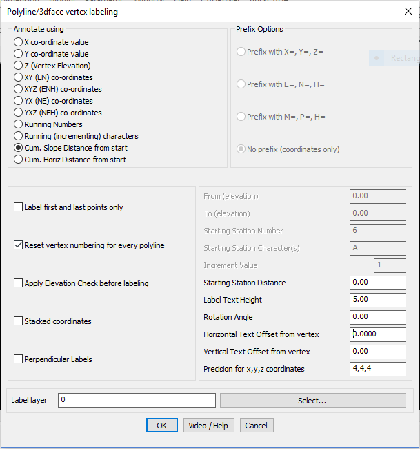 If Running Number is chosen as the label option above, then this option allows the first station number to be set. You may want to set this to a number higher than 1 if this polyline is being labeled in succession to another polyline which was preceding it.