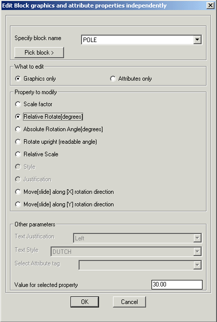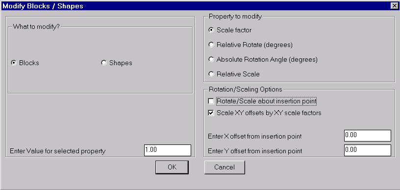 It is possible to rotate or scale the blocks about their own insertion point or about any other point relative to the insertion point. The relative point can be specified by means of an offset distance in X and Y directions from the insertion point.
