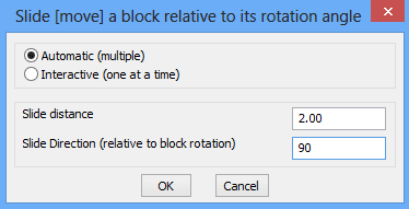 The CP_BLKSLIDE command is used for moving blocks in a direction which is relative to the rotation angle. It can be also used for increasing or decreasing the spacing between blocks and adjoining features by moving them in a specified direction.
