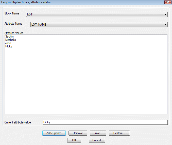 Menu : CADPower -> Blocks -> Attribute-Related -> Multiple-Choice attribute editor Setup