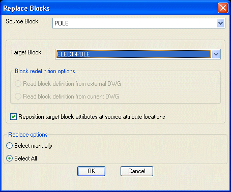 Read block definition from current DWG: Checking this option allows one block to be replaced with another block of the same name and the updated block definition will be read from within the current drawing.