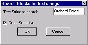 The CP_SRCHBLK4TXT command searches block definitions for embedded text strings and lists all blocks matching the given text string specifications. Text String to search: Enter the text string to search here. Wildcards are accepted.