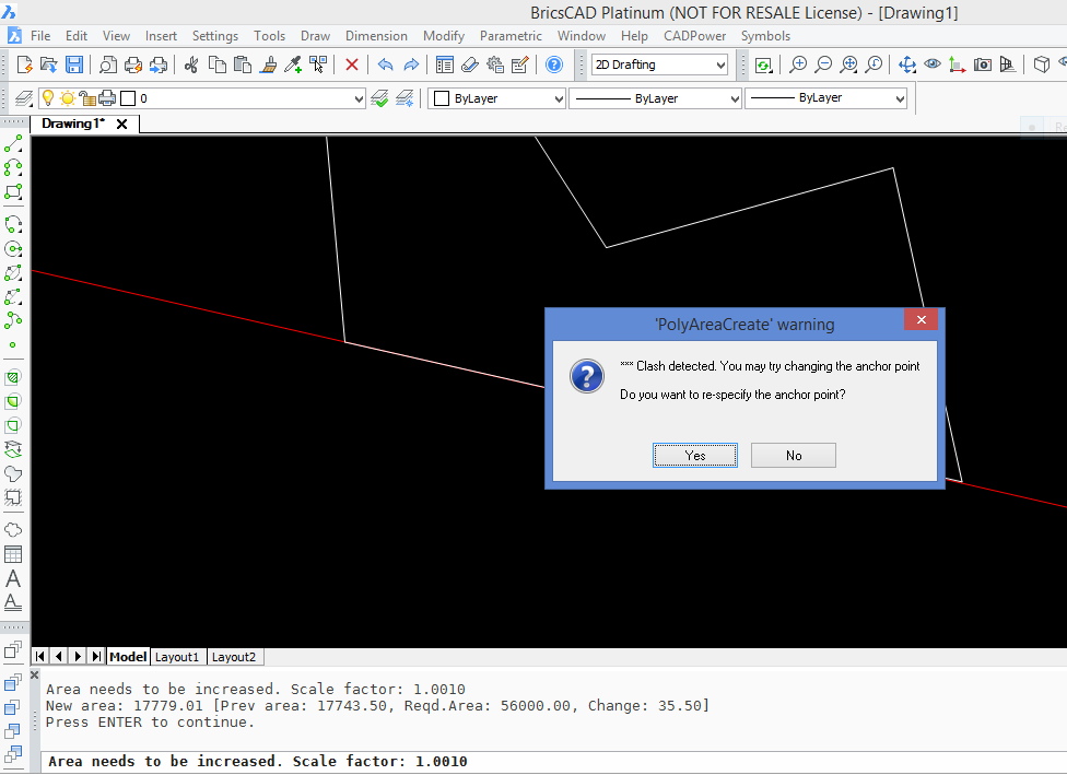 Clash Detection: Often, when you increase the area of a polygon by incremental amounts, it is necessary to stop when an adjoining polygon boundary is reached. This is enabled by Clash Detection. When enabled, the command stops when the polygon touches a neighboring polygon, line or arc boundary. At this point, you have the option to change the anchor point and re-scale the polygon in a different direction or accept the existing one and exit the command.