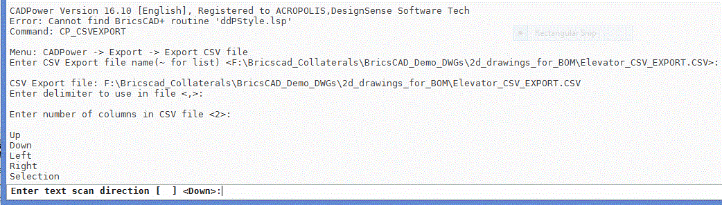 CP_CSVEXPORT is entirely command-line driven with no dialog boxes. It asks the user for the CSV file name, delimiter and the direction in which the text objects must be sorted. In addition to "Up", "Down", "Left" and "Right", there is also an option called "Selection" which allows you to export in the same order in which the selection was made.