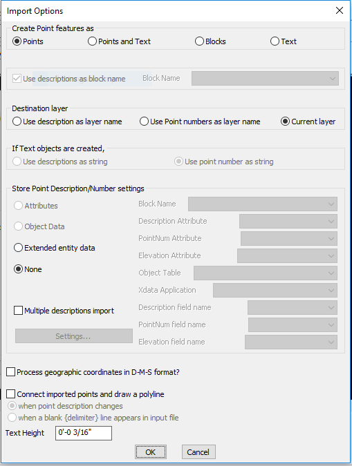 Import Options: These settings relate to import of ASCII data into AutoCAD / BricsCAD.