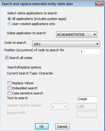 The CP_XD_SEARCH command does a search (and optional replace) of extended entity data. You can search xdata fields by code as well as by position in the xdata structure. The search type will automatically be numeric or text based on the field type being searched. When there are multiple occurrences of the same code within the xdata structure, you can specify which occurrence to be subjected to the search / replace.