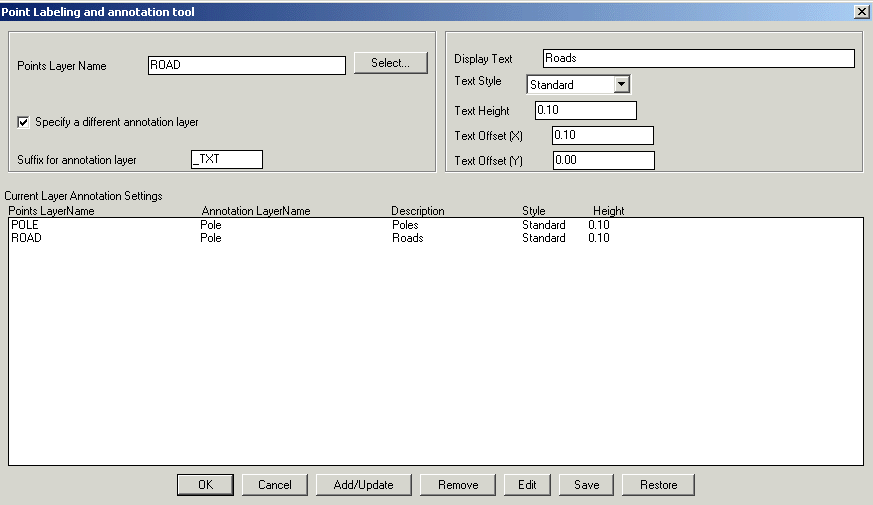 The GT_ANNOTPOINTS command is used to annotate a set of points based on a layer lookup table. This command is useful in several surveying applications where the raw data is first imported into AutoCAD / BricsCAD as a set of random point objects placed on several different layers. It is then often required to label these points with meaningful and descriptive text labels with correct text style and height. This command helps to create such a labeled text. Each set of annotation parameters (like text label, style, height etc) is specified on a per-layer basis. These sets of per-layer annotation parameters can be saved/restored from ASCII files.