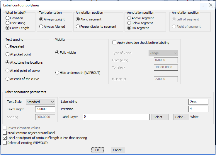 Hide underneath (WIPEOUT): Creates labels with a text mask underneath. Contours and any other objects crossing the label will not be visible. The WIPEOUT objects are used for masking and these are placed in a fixed layer called CONTLABEL_$TEMP$. The option caledl Delete all existing WIPEOUTs in ths same dialog box clears and removes any existing text masks (WIPEOUTs).
