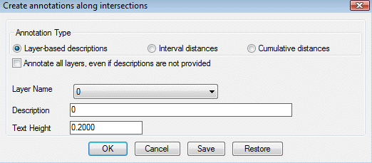 The GT_CREATEANNOT command helps you create annotations across a line based on the intersecting objects along its path. The annotation is aligned perpendicular to the direction of the path and it can be either one of the following: Layer names/descriptions, Interval Distance or Cumulative Distance.