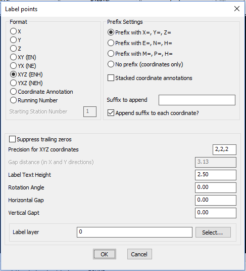 Prefix with E=, N=, H= Choosing this option places the prefixes, E=, N=, H= before each coordinate value