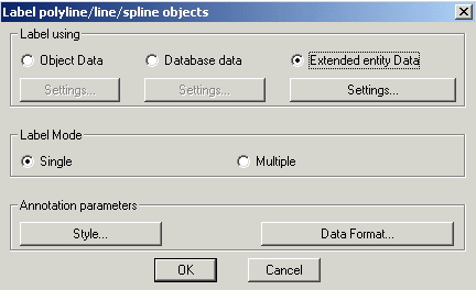 The GT_PL_DATALBL command is used to label polylines with attached data – like object data, extended entity data or database-linked data. When multiple object labeling is chosen, the label is automatically placed at the mid-point of each object. When single object labeling is chosen, the user has to specify the label locations. You can create complex label strings by joining data from multiple fields with a specified delimiter, with prefix/suffix etc as required.