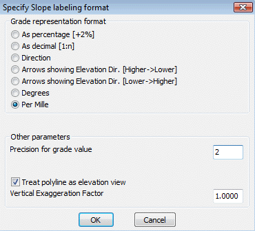 Treat polyline as elevation value: If this option is checked, the polyline is treated as an elevation view (or long/cross section as called in some countries) and the segment slope annotation is done accordingly. In elevation view, the polyline is assumed to be drawn in the Z plane.