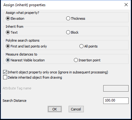 Assigns either of the two primary properties (Thickness or Elevation) to selected points, polylines, lines, shapes, blocks or circles. These properties are inherited from nearby text objects or from block attributes and converted to their numeric values. Typically, any object, which has only one DXF Group Code 10, can be used.