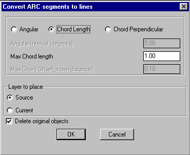 Converts arc segments in polylines or ARC objects to polylines with linear interpolated segments. The arc section is approximated by connecting with a number of straight line segments. The linear segment of the original polyline is left as it is. The arc approximation (interpolation) can be done by any one of the three methods: