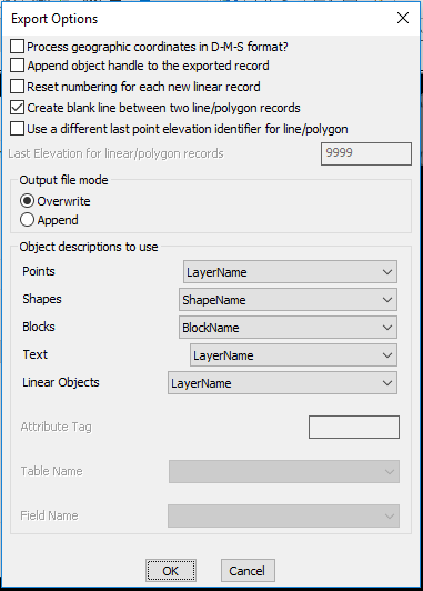 Object descriptions to use: This section specifies the object description that can be used by each of the object types. The basic properties of objects like layer-name, block/shape name, attribute values (for blocks) or object data (if AutoCAD Map is running) can be specified. This will go into the Description field.
