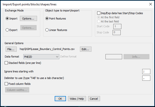 The GT_IMPEX command allows point and linear objects to be exported to a variety of ASCII Text formats or imported from ASCII files. You need to specify before-hand whether you are exporting or importing linear features or point features. These two feature types cannot be mixed during an import or export operation.