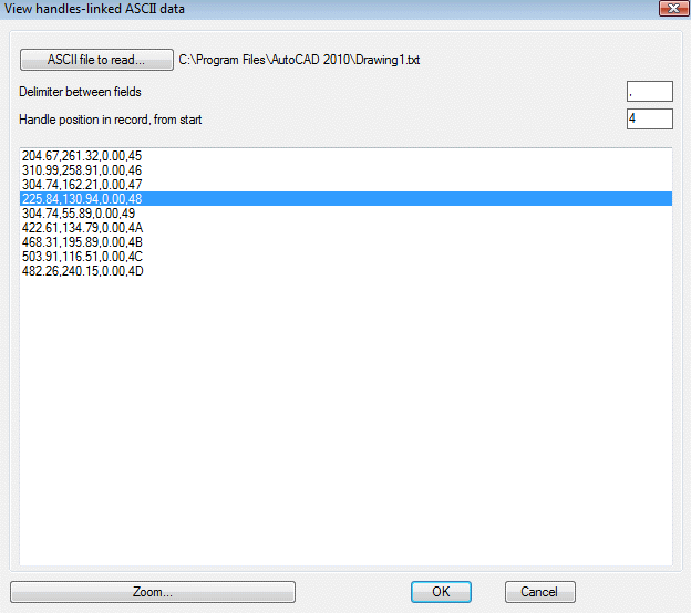 Using the GT_VIEWLINKED command, you can view and correlate information between an ASCII / CSV file and its drawing by selecting a record and have the command zoom to the corresponding object in the drawing. The handle of the object is used as a key to make this connection.