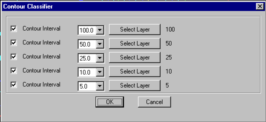 You can select a maximum of five contour intervals and specify a layer name for each of these contour intervals. The selected contour objects are then placed in their allotted layers. You can select polyline objects or LDDT contour objects.