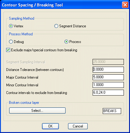 The GT_CONTDIST command is an intra-contour spacing checker and contour breaking tool. Often, when the distance or spacing between two adjacent contours is too small, it is difficult to either view the contours clearly or to create un-cluttered labels to depict the contours. In such situations, it is useful to break the contours at locations where the distance between the contour and the adjacent contours on either side is less than a specified Distance Tolerance.