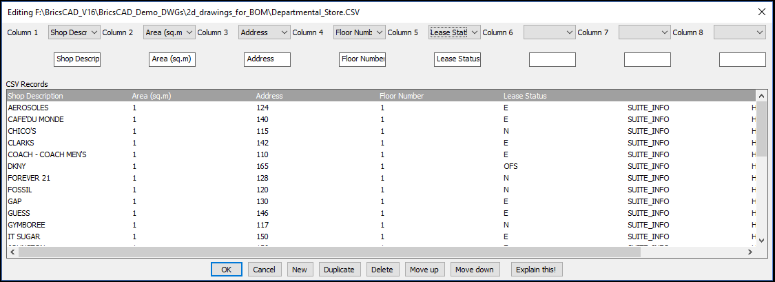 GT_CSVEDITOR is used to edit comma delimited ASCII text files within the CAD editor. The current version allows to edit CSV files with a max. 8 columns of CSV data. The data is presented in a dialog box and each column can be edited by entering a new value in the edit box or choosing one from the pull-down menu. A pre-defined set of probable values can be defined and supplied to the command.