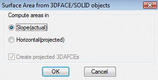 Computes the surface area as well as horizontally projected area of selected 3DFACE objects. In addition, you have the option to create the 'projected' 3DFACE objects on the XY plane.