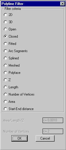 The length, area, number of vertices or start-end distances are specified by entering < n, <= n, > n, >= n, = n, /= n where "n" is the value to check for.